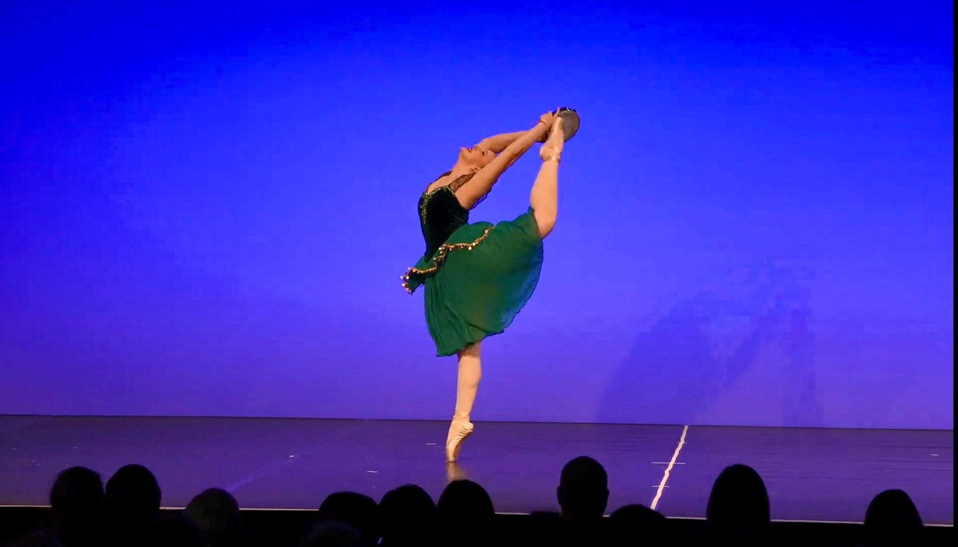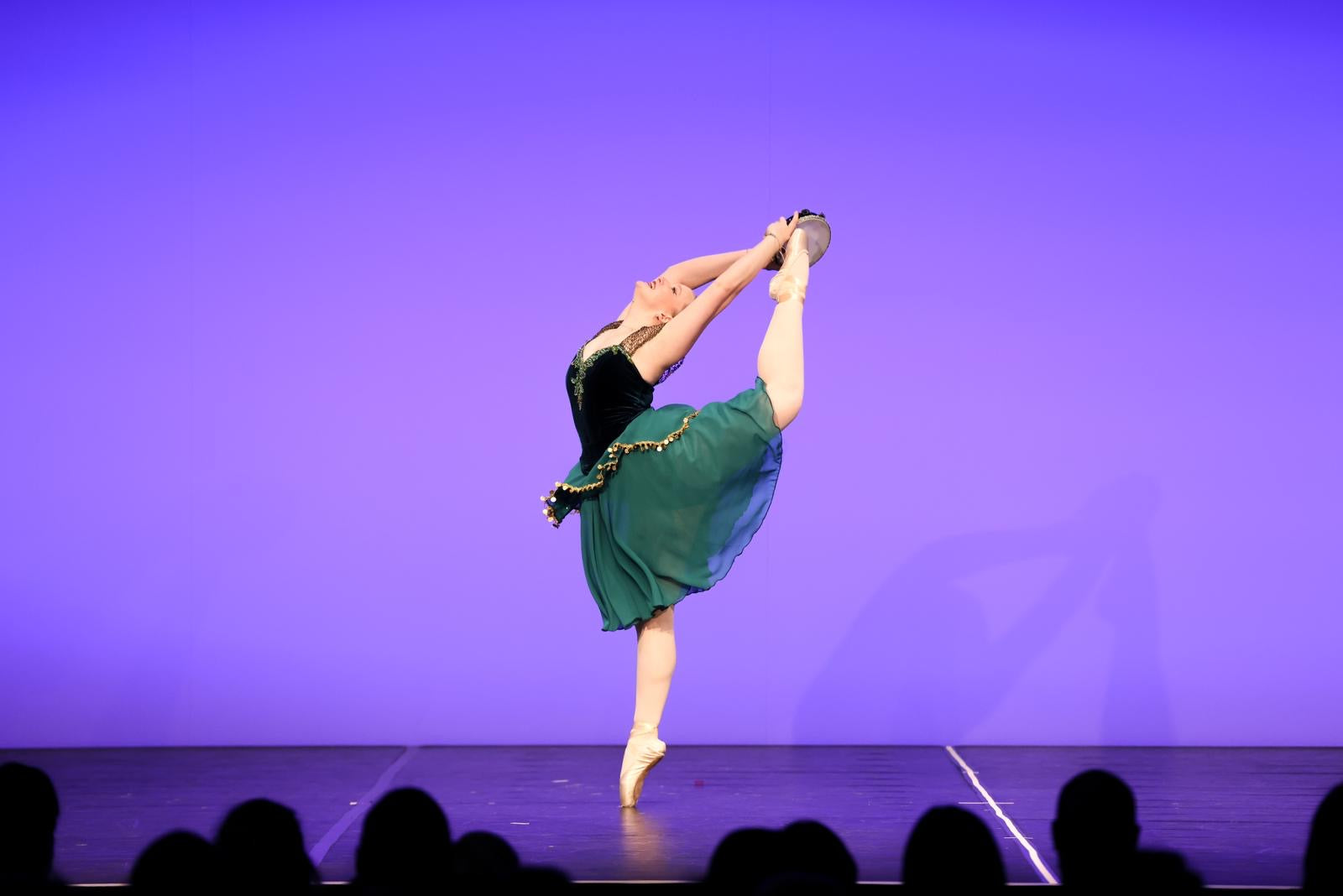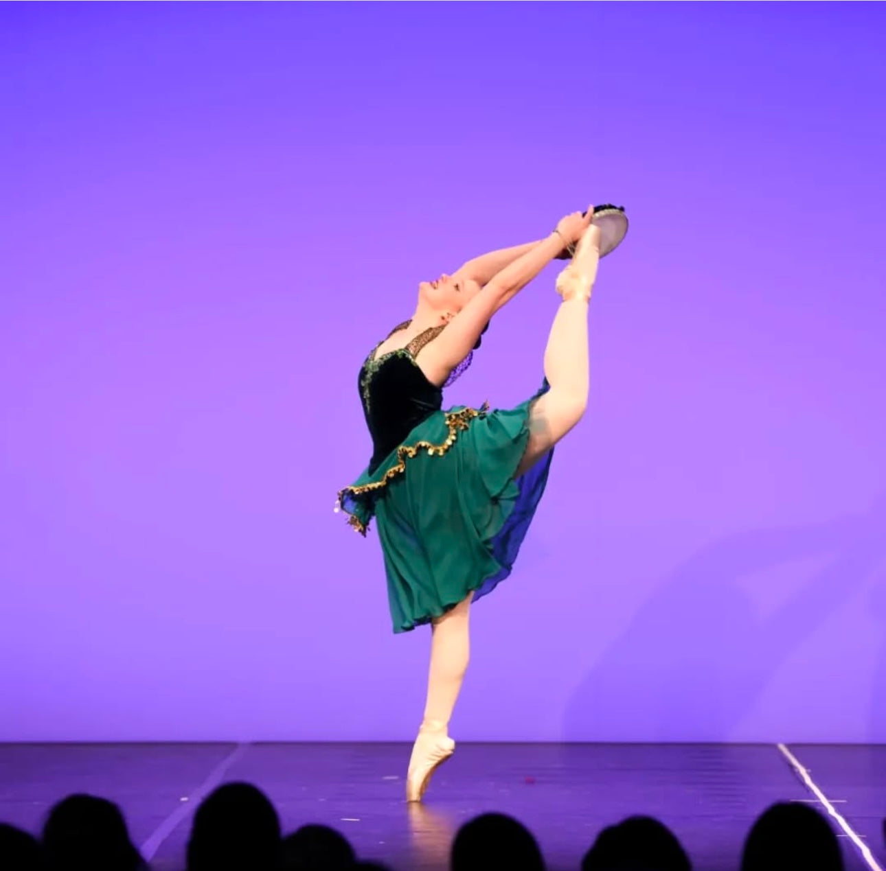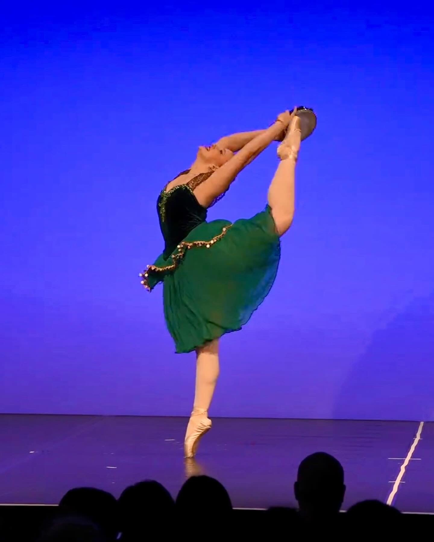 Dieses Kostüm für die Esmeralda-Variation besteht aus einem figurbetonten Mieder aus dunkel schimmerndem Samt, dessen tiefer V-Ausschnitt und transparente Spitzeneinsätze an den Schultern die Linien von Oberkörper und Armen elegant hervorheben. Entlang des Ausschnitts und im Vorderteil sind funkelnde Applikationen angebracht, die bei Drehungen und Sprüngen das Licht einfangen und den dramatischen, temperamentvollen Charakter der Rolle unterstreichen.