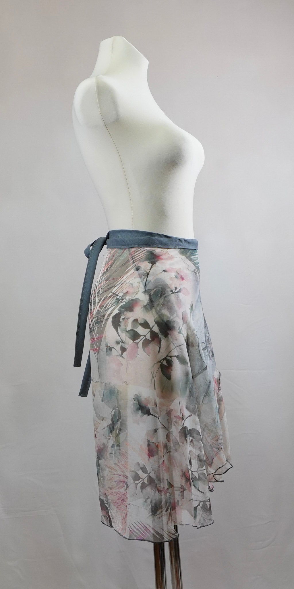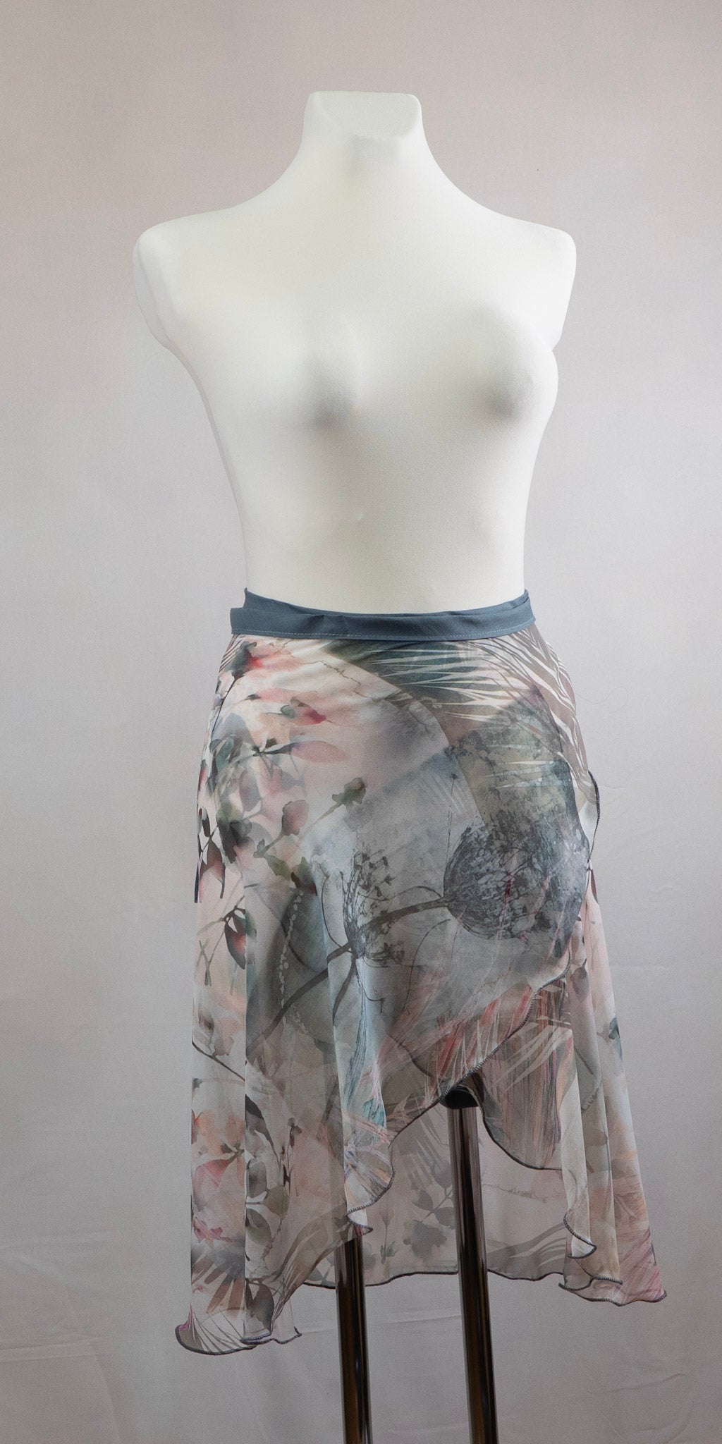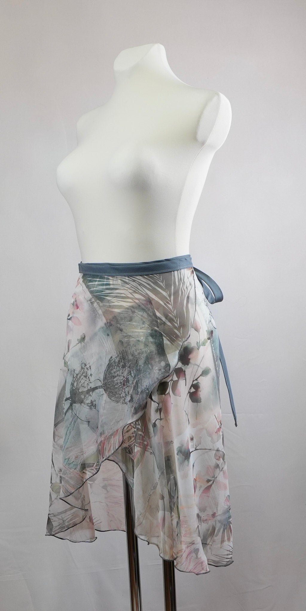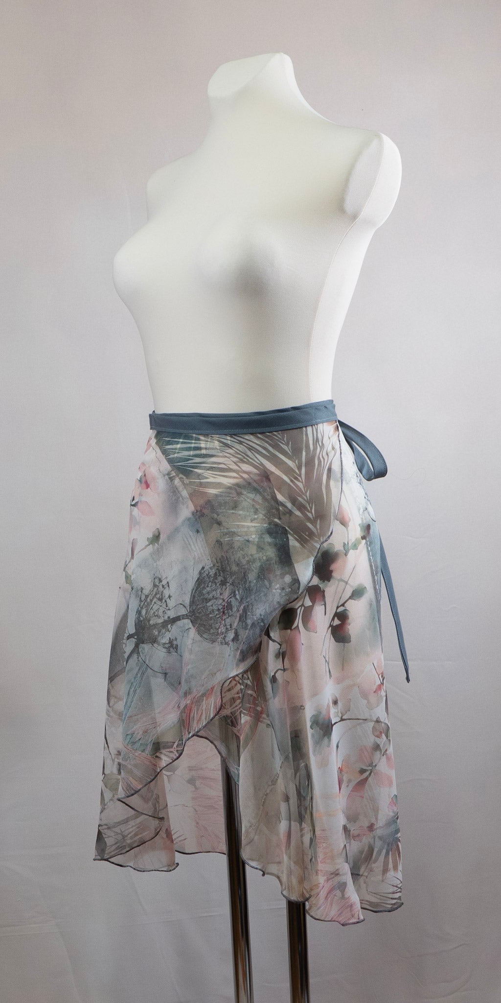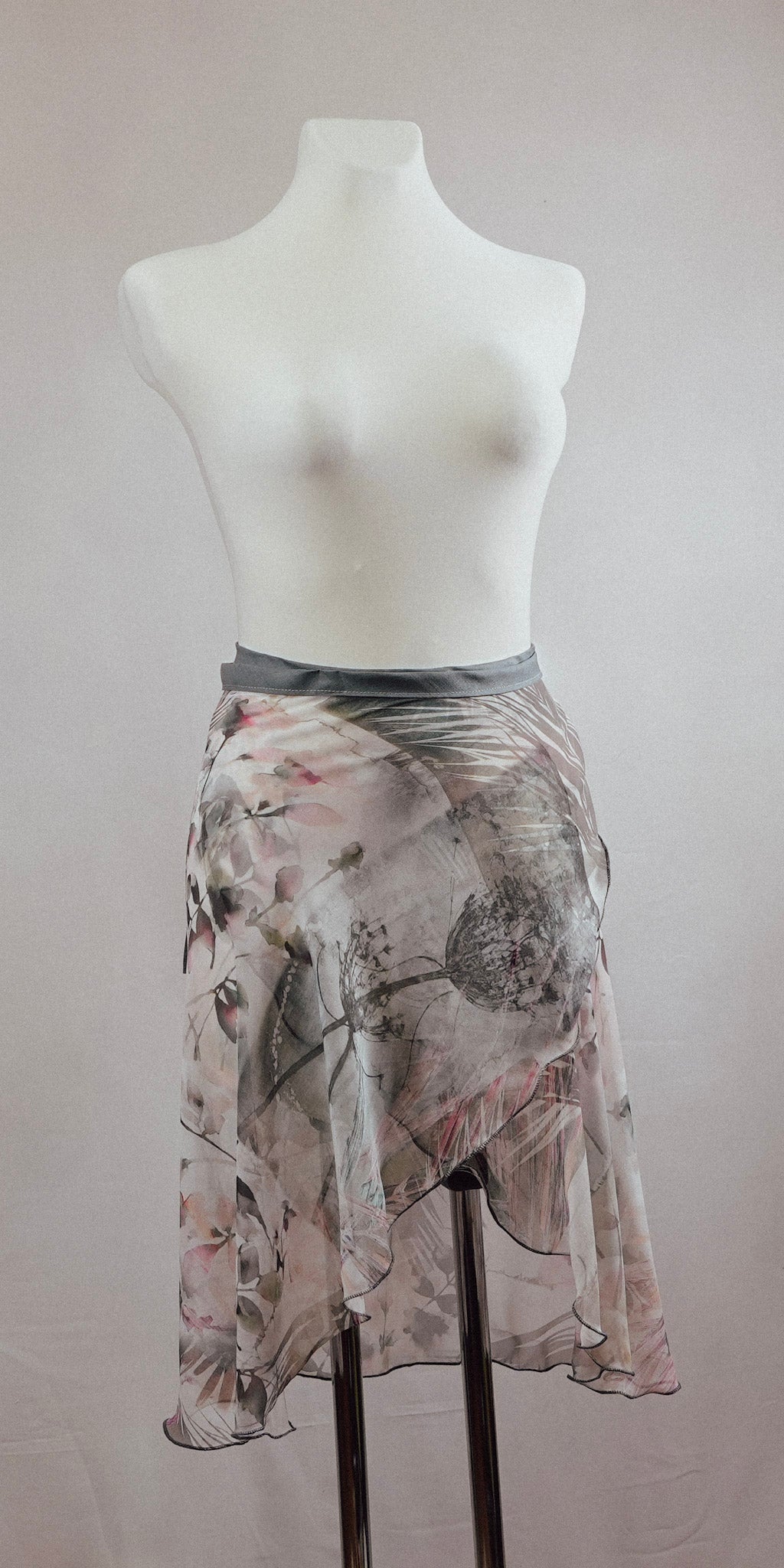 Dieser handgenähte Wickel-Ballettrock wird aus einem luftigen, weich fließenden Material gefertigt und zeigt einen kunstvollen Print in zarten Pastellnuancen wie Grau, Rosa und Beige, der an Aquarellmalerei erinnert. Der asymmetrische Schnitt umspielt die Körperlinie und öffnet sich elegant bei jeder Bewegung, sodass ein leichter, fließender Effekt um die Beine entsteht – ideal für Training und Auftritte.